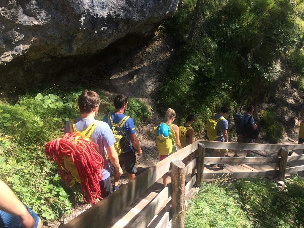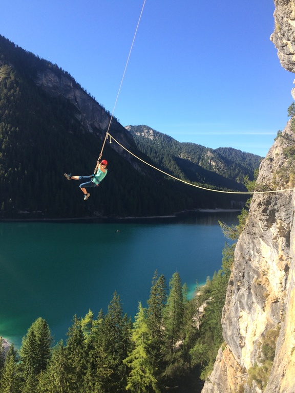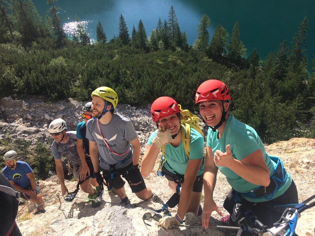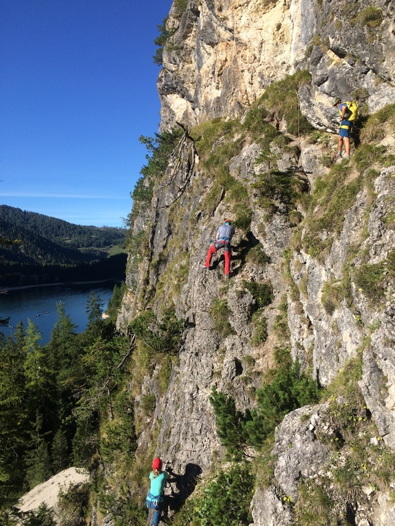Třetí den opět začínáme od jezera Braies. Tentokrát si otestujeme lezeckou výbavu přímo ve skalách. Terorie a opáčko bezpečnosti je nutností a všichni znovu povinně uzlujeme a zkoušíme. Je fajn si vše vyzkoušet u skály ještě dole. Poté, co mi vypadl kyblík (jistítko) z ruky, jsem alespoň na vlastní kůži zjistila, co dělat a že bych na stěně úplně v háji ještě nebyla. Ten den jsme si vyhráli docela dostatečně...