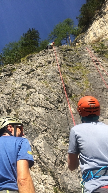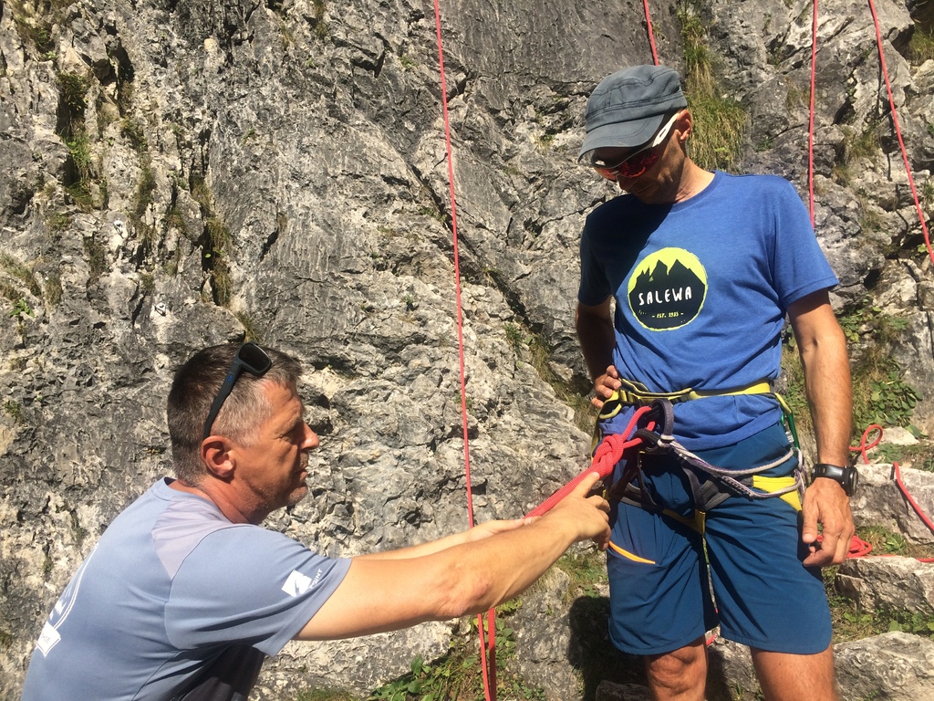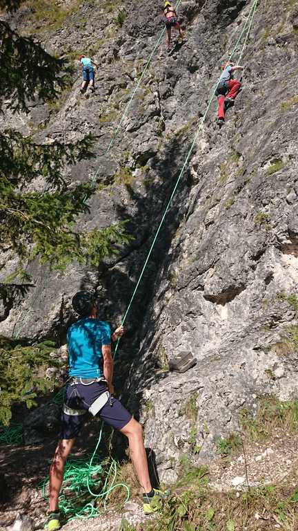 Teoretická příprava a praktické otestování nejen materiálu, ale také toho, jak na tom jsme lezecky i fyzicky, nás čeká u jezera Braies nedaleko městečka Prag´s . Učíme se metodiku navazování, bezpečnosti i slaňování s jištěním zdola. Každý musíme zvládnout správné navázání k sedáku, ať už budeme lézt nebo jistit. Je to nekonečné uzlování a rozvazování, které další dny jako když najdeme. Automatické Salewa jistítko, neboli kyblík si pochvalujeme na první dobrou.