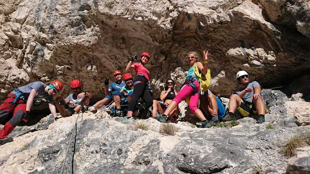 Čeká na nás i krátká ferrátka. Italští guidi za pomoci překladů Gaba Adamce (horského vůdce a šéfa zastoupení Salewy pro střední Evropu) nás provedou teorií bezpečnosti na ferratách a práce s ferratovým setem. Na vlastní kůži si osaháváme a testujeme lehkoučké a snadnoovladatelné karabiny, které skutečně činí zdolání této hravé ferrátky více komfortní.