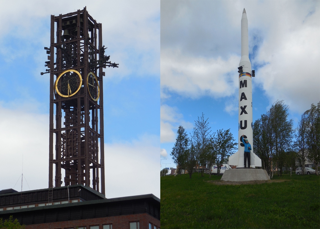 Kiruna. Dřevený kostel, který se celý rozebere a přesune před rostoucí těžbou. Věž radnice, půlnoční slunce, muzeum Sámů, na sever od města se taky nachází kosmodrom.