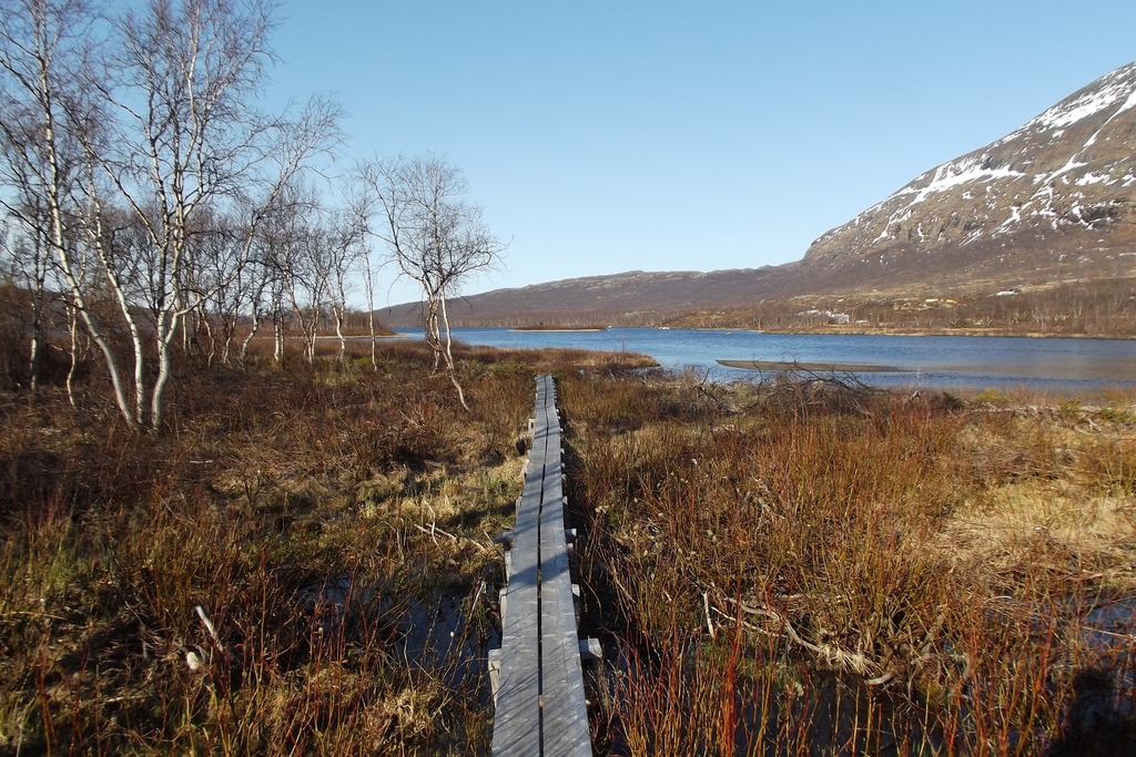 V národním parku Abisko narazíte na řídké nízké březové lesy, tu a tam nějaká kytka a keříky brusinek. Na úrovni kolem 800 metrů nad mořem se břízky začínají ztrácet a vidíte pouze traviny a nízké keříky, v nejvyšším místě cesty v Tjaktja Pass už nejsou ani keříky. Nebo tam možná byly, ale neviděli jsme je kvůli více než metru a půl sněhu.