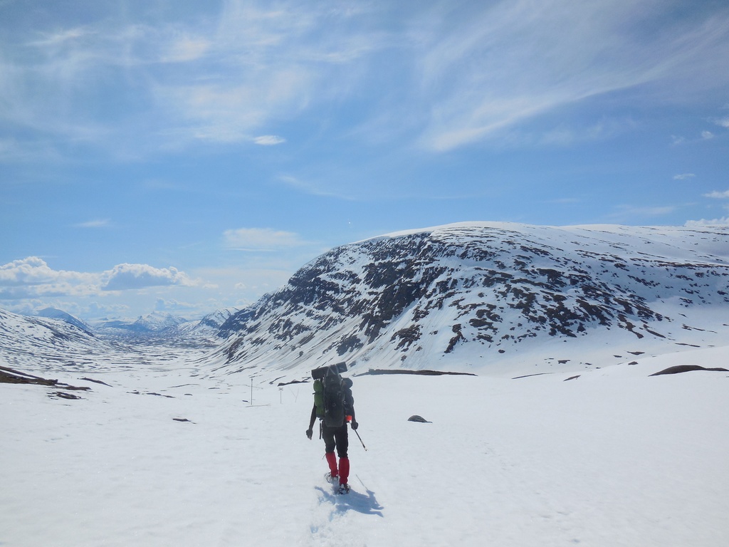 Nejvýše položená část Kungsleden je Tjaktja Pass. Průsmyk je sice jen v 1150 m. n. m. a je 28. května 2016, ale jsme daleko za polárním kruhem a sníh je místy až po ramena. Naštěstí jsme měli sněžnice.