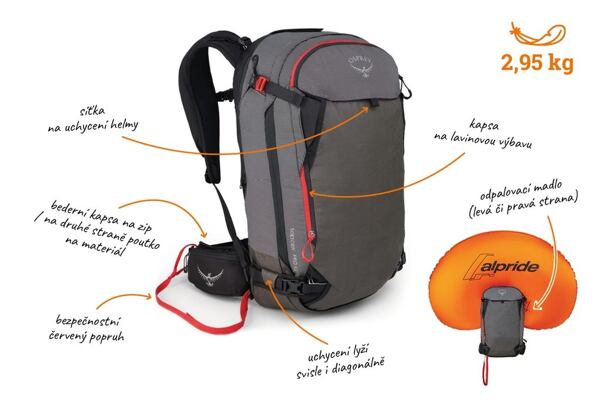 Díky kombinaci pohodlných batohů Osprey s nejlepší technologií firmy Alpride, vznikl lehký lavinový batoh. Pánský Osprey Soelden Pro AVY a dámský Sopris Pro AVY.