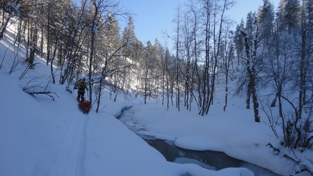 Celou šířku dna této rokle tvoří řeka, která se větví a meandruje z jedné strany na druhou. Vše je zapadané sněhem. Kvanty sněhu. Ale co je horší než mráz a vidina toho, že tento úsek budeme brodit ještě dlouho, je fakt, že tu nikde není a dlouho nebyla žádná cesta. Motáme se křovím kolem řeky a podle terénu přecházíme z jedné strany na druhou, z ostrůvku na ostrůvek a tak pořád dokola. Problém řek a potoků v jejich zimním přecházení je nečitelnost. I malý potůček, pokud proudí rychle, nezamrzne ani v dlouhodobých třicetistupňových mrazech. Naopak velmi široká a pomalá řeka může být bez problému zamrzlá i v mírnějších teplotách, a tak po jejím ledu můžete bezpečně přejít. Nejvážnější ale je, že i na nezamrzlé vodní ploše se může udržet sníh a neroztát.