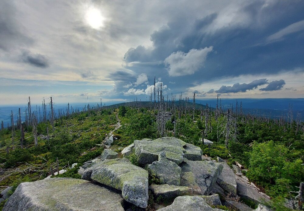 Vyběhl jsem z Dešenic přesně v 6:00, takže to znamenalo vstávat cca v 4:15. Už začátek běhu mě přesvědčil o tom, že to nebude žádná legrace. Tuto část Šumavy dobře znám, tak jsem si říkal, že vlastně první stoupání začíná až v Hamrech. Párkrát jsem z Hamrů na Ostrý šel. Je to pohodové, mírné stoupání až Pod stateček, pak se to trochu zvedne a poslední část jsou trochu kameny. Ale když jsem viděl, jak Honza Krabec naplánoval cestu tady, bylo mi jasné, že to žádná legrace nebude. Už „nesmyslné“ stoupání z Dešenic a pak klesání na přehradu mi utvrdilo, že je Honza fakt vtipálek. Pak v Hamrech po zelené, po louce… Hned z kraje totálně mokré boty od rosy… Na Ostrém jsem byl okolo 8:00 a byl krásný výhled, obloha úplně bez mraků.