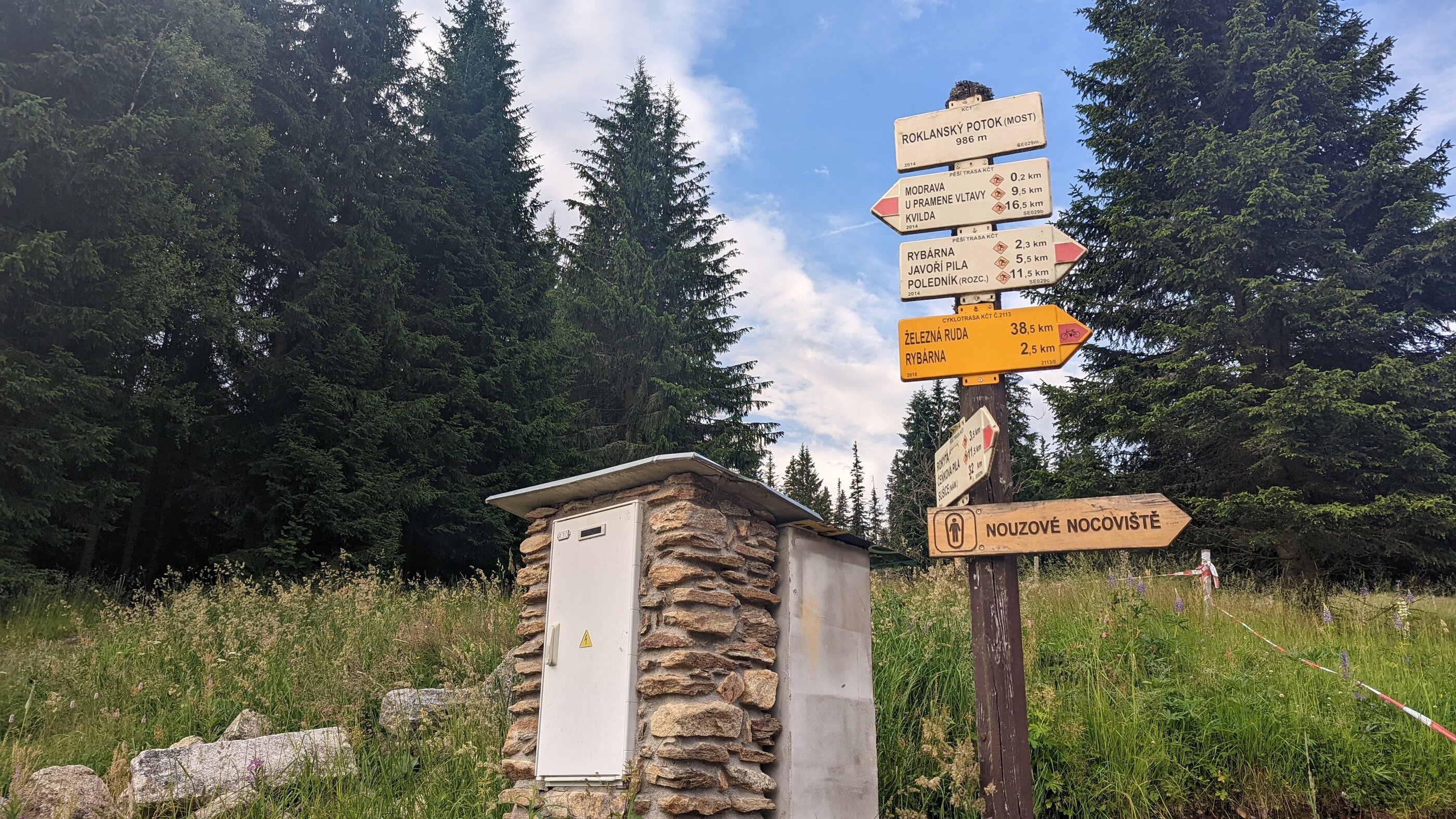 Pak cesta začala stoupat na Polom (mimo turistické trasy), všude dost bahna a vody. Šlo se skoro potokem. Paradoxně mi to vyhovovalo a nálada se lepšila. Pustil jsem si i muziku do sluchátek. Nahoře jsem potkal paní s pánem, chvíli popovídal, doplnil si od nich pití a bylo to dobré. Navíc, pochvala Honzovi za krásnou stezku nahoře na Polomu. Tohle mám rád. A ještě, když jsem kousek od jezera Laka předběhl do kopce mladý pár na kolech, výborná nálada byla zpět a energie bylo na rozdávání. To už jsem měl v nohách okolo 45 km a 1500 m převýšení. Pak následoval seběh do Prášil, kde jsem si dal výborný vývar, usušil batůžek, odpočinul si a bylo to parádní.