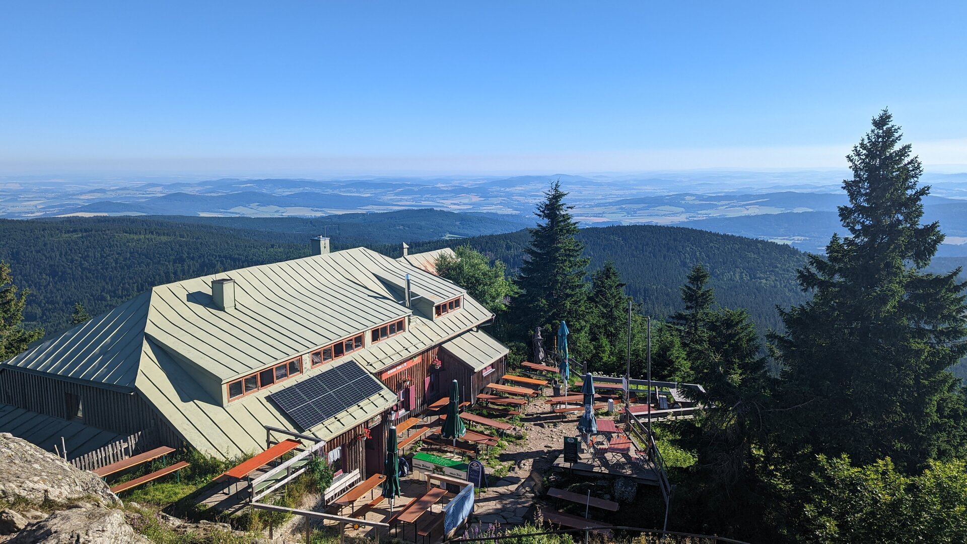 První větší zastávka byla asi po 20 km na Alpské vyhlídce, kde jsem si dal polévku a kolu. Pak mě čekalo 30 km bez možnosti jídla a pití. To bylo celkem dost, takže jsem asi po 20 km musel poprosit nějaké turisty o vodu. Začalo být zase docela teplo, i když to bylo lepší než první den. Doběhl jsem do Nového údolí, kde jsem si dal kulajdu a pití a chvíli si odpočinul. Před sebou jsem měl už „jen“ stoupání na Třístoličník. Pár kilometrů před poslední studánkou před stoupáním jsem (pro mě náhodou, on o mém běhu z emailové komunikace věděl) potkal Aleše Sedláka, výborného českého ultraběžce na procházce s přítelkyní (on těch 160 km přeběhl za 17 hod). Dal mi gel, magnésium a celkově mě tohle setkání dost potěšilo. A taky jsem si říkal, že mi nesmí do kopce předejít (smích). Stoupání bylo naprosto v pohodě a nahoře bylo parádně. Opět až na Plechý byla nádherná cesta po hřebenu, tohle fakt můžu.