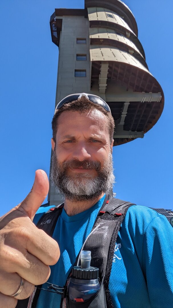 Už mě čekal jsem „jen“ výběh na Poledník, seběh a jen zvlněný terén na Modravu (alespoň takto jsem si to představoval). Na Poledník to šlo celkem v pohodě, cestu znám dobře. Jen to horko. Celou dobu nebyl ani mráček. Nahoru jsem přiběhl a u kluka, který prodával v bufetu jsem se dozvěděl, že už nemají skoro nic. Žádná kola, žádné nealko pivo, žádná voda. Naštěstí se objevila jeho kolegyně, která už podle trička Ronhill má s během asi něco společného. Takže najednou byla alespoň voda, popovídali jsme a snědl jsem jí brambůrky. Za tuto pomoc jí moc děkuji a když se ozve, bude mít u nás v Rock Pointu slevu na běžeckou značku Ronhill).