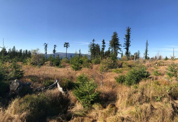 Odtud jsme pokračovali po lehce se vlnící, přesto stále stoupající červené turistické trase na Můstek. Pohled na německý Javor nebo český Ostrý byl přímo sluncem zalitý a provázel nás celou dobu po přeběhu známého šumavského hřebenu.
