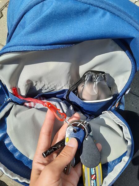 Při mé cestě mě také potěšila vnitřní karabina na klíče, kde jsem si zacvakla klíče od svého bytu a nemusela jsem se díky tomu strachovat, abych klíče někde neztratila. Nouzovou píšťalku jsem k ničemu nevyužila, nicméně můj 5letý bráška z ní měl velkou radost.