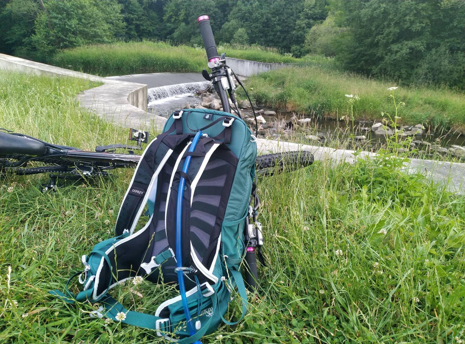 Jako další plus musím podotknout, že jsem byla mile překvapena, jelikož se do prostoru pro vodní vak vleze také vak od značky CAMELBAK. My máme doma vak s 3litrovým obsahem. Vlezl se do batohu OSPREY úžasně. K uchycení šlauchu na pití jsem využila gumičky, které jsou na batohu k zachycení turistických hůlek. Jelikož jsou tyto gumičky stahovatelné, bylo pití i za jízdy bezpečně zajištěné.