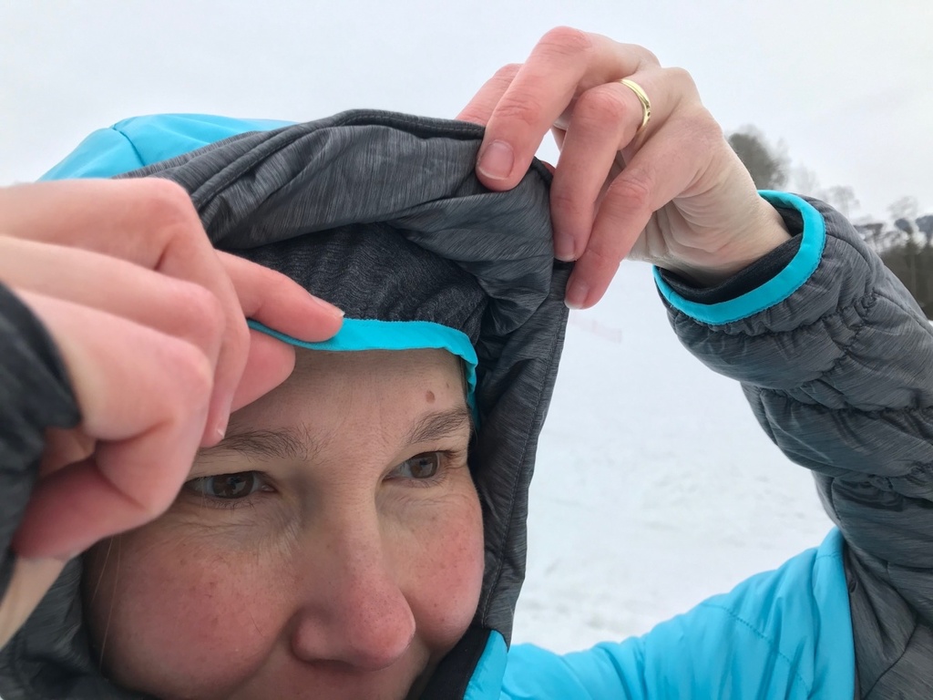 Můžete tak v případě potřeby stáhnout kapuci úplně na maximum (shora až k obočí, zdola až k hornímu rtu). Kapuce nejde přetáhnout přes skialpovou helmu, ale helmu můžete dát přes ni. Většinou však sjíždím z vrcholů v membránové bundě a tam je kapuce pro přetažení přes helmu již uzpůsobená, takže tuto funkci od zateplovačky neočekávám.
