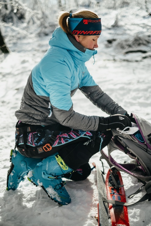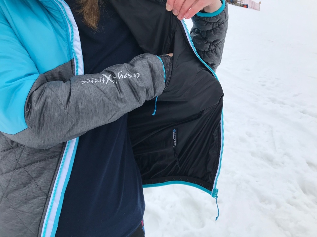 Už na ramínku mě upoutala skvělým designem, nádhernou barevnou kombinací. Protože mám od Crazy Idea už skitouringové kalhoty a zimní sukni, tak mi zateplovačka Electra vytvořila trojičku do zimních hor, která k sobě pěkně pasuje. Jakmile se bundy dotknete, pohladí vás jemná látka, až vás to zaskočí a v první chvíli zaváháte, jestli je bunda mechanicky odolná. Ale bez obav.
