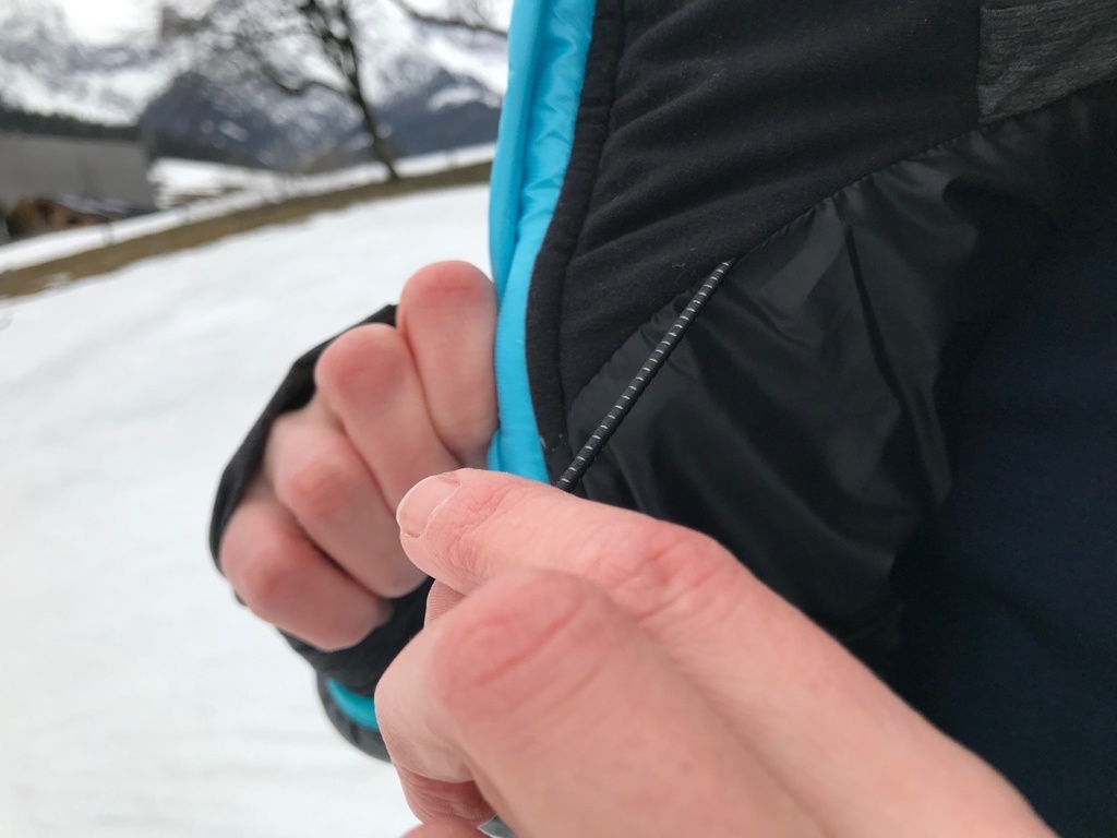 Můžete tak v případě potřeby stáhnout kapuci úplně na maximum (shora až k obočí, zdola až k hornímu rtu). Kapuce nejde přetáhnout přes skialpovou helmu, ale helmu můžete dát přes ni. Většinou však sjíždím z vrcholů v membránové bundě a tam je kapuce pro přetažení přes helmu již uzpůsobená, takže tuto funkci od zateplovačky neočekávám.