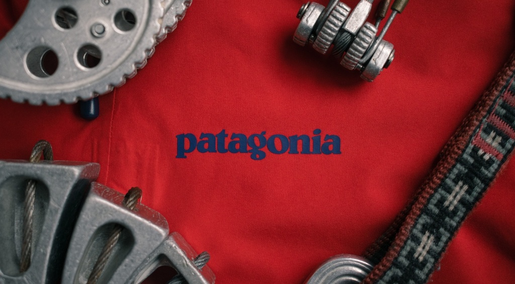 Detailní záběr proslulého loga Patagonia s lezeckým vybavením