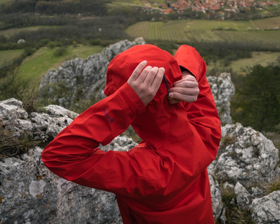 Kapuce je dostatečně velká, takže se pod ni vleze i lezecká helma. V zadní části kapuce ji lze stáhnout tak, že ochrání takřka celý obličej. Když otáčím hlavou, tak kapuce skvěle drží, neposouvá se a nikde neškrtí, nebo nezavazí.
