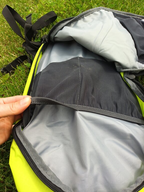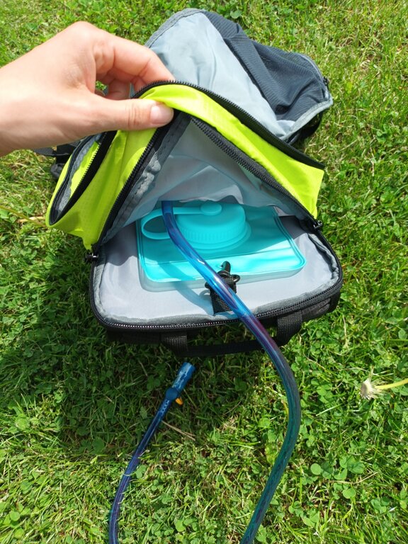 Hlavní kapsa je zároveň nejhlubší a z jedné strany se dá plně rozepnout až dolů, což je užitečné pro plnění batohu věcmi. Uvnitř kapsy na zádové části jsou našité 2 další malé kapsy stažené v horní části gumičkou, pro uspořádání věcí v batohu velmi praktické. Poslední kapsa v zádové části je určena pro vodní vak o objemu 1 litr, který je součástí batohu. V případě, že bych nechtěla využít bederní popruh, je možné ho odepnout.